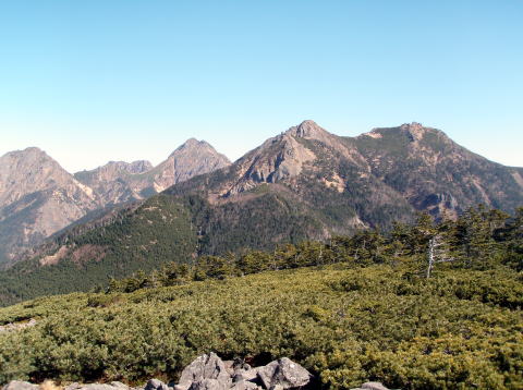 山頂は素晴らしい眺めで、阿弥陀岳・赤岳・権現岳と続く八ヶ岳の峰々が見えた。