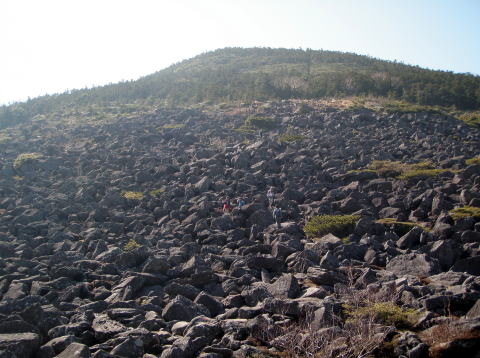 山頂は岩屑で、蓼科山の山頂を小さくしたものようである。
