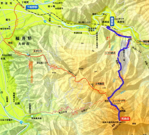 民宿林湊〜勝原スキー場〜リフト終点〜シャクナゲ平〜荒島岳(往復)〜勝原駅→福井駅→越後湯沢→大宮