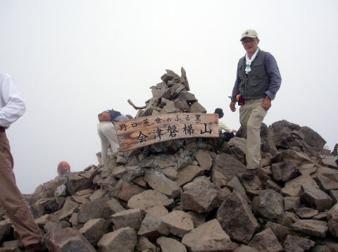 磐梯山(1819m) 百名山36座 1819m 岳温泉→磐梯レークライン→八方台登山口〜中ノ湯跡〜弘法清水〜磐梯山〜八方台登山口→二本松→東北道→東京 平成18年8月15日(火) 八方台登山口に9時30分前に到着。 駐車場は満杯、たまたま1台が出たため、そこに駐車ができた。 30分で中ノ湯跡に到着し、湖畔を見ながら登って行く。 お花畑コースを廻って、弘法清水に行き、そこから磐梯山へ40分程で12時10分磐梯山頂上に着く。 頂上には茶店があり、昼食を取ってから下山をする。 タカネナデシコ コガネキク 会津磐梯山 頂上(1819m) 下山時の景色