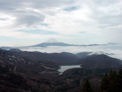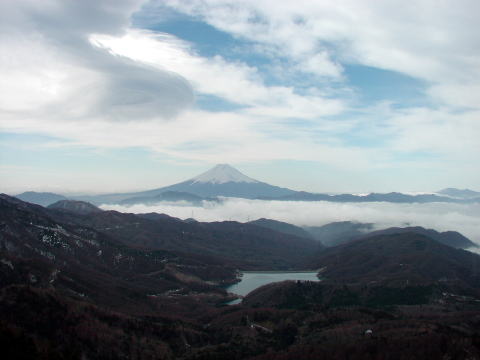 福ちゃん荘を経て、唐松尾根を通り雷岩へ、唐松尾根から大菩薩湖・富士山がよく見える。