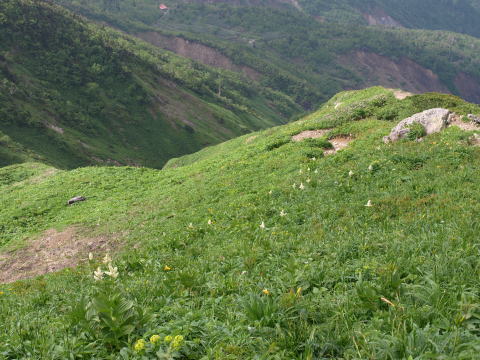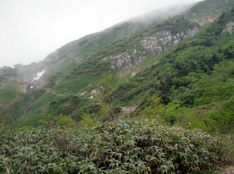 砂防新道を歩き、別当谷のガレ場を見下ろす、別当覗きの当たりから樹林帯に入る。