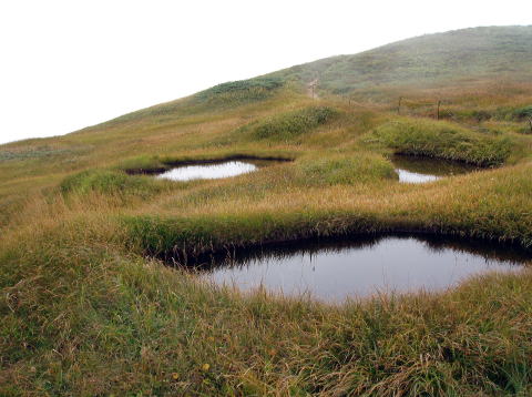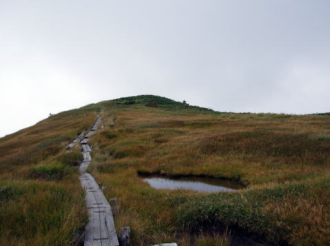 避難小屋から池塘が点在する木道を歩くと階段状に整備された急な道を登ると、巻機山の頂稜に出たところに9時50分到着した。