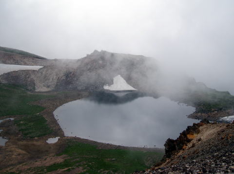 朝日岳と蚕玉岳との鞍部を出ると、眼下に美しい水面を見せる権現池の山上湖が見える。