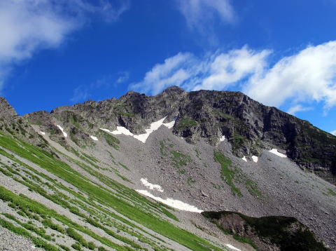 本谷橋を過ぎ、屏風岩の裾を巻いて行き、涸沢の谷に入ると前穂高岳が見えてくる。