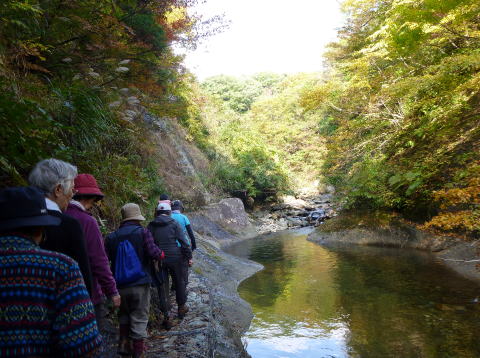 仙山線に沿っている林道を小形バスで行き、13時30分頃、面白山紅葉川渓谷入口に到着し、トレッキングをする。
