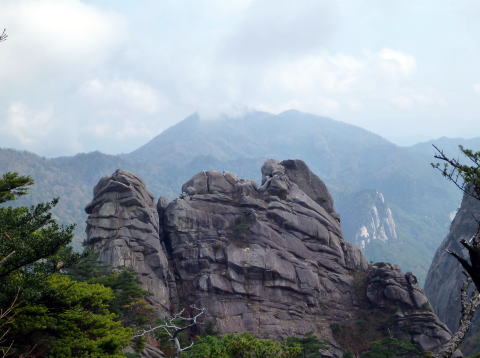 水場を過ぎガレ場の手前で、雨がやみ休憩をする。8時55分頃、袖ダキに到着し大崩山のすばらしい景色が見えた。