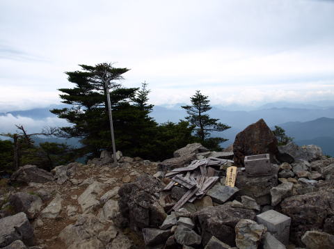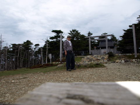 防護柵を出ると、ひと登りで八経ヶ岳山頂に11時30分過ぎに到達し、山頂は風があり、曇っていた。
