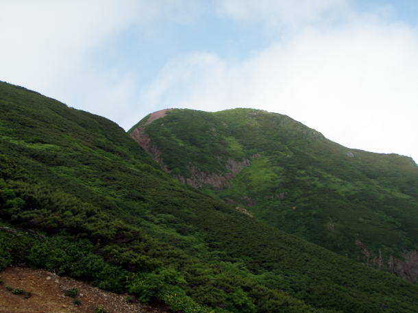 馬の背から山頂の手前にある小ピークを目指しハイマツ帯を縫って登り、そしてガレ場を登り小ピークから丸みのある斜里岳頂上に出た。