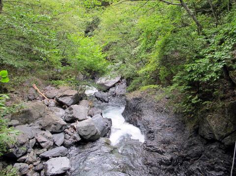 下山路は横窪沢小屋、ウソッコ小屋を通り、所々に沢の滝が見られ吊橋を渡る。