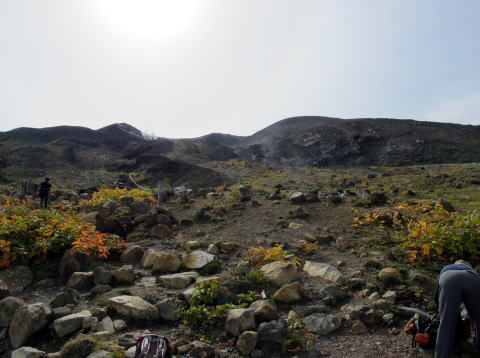 美瑛岳方面に行く雲ノ平分岐を過ぎ、10分程て十勝岳避難小屋に9時20分頃到着し、休憩をとる。