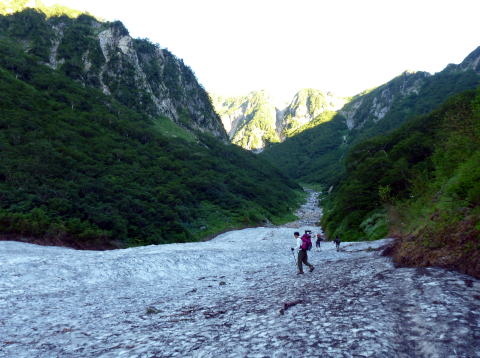 水場を過ぎると、頂上に向かう登山者とすれ違う。槍沢の雪渓で、一汗拭う。